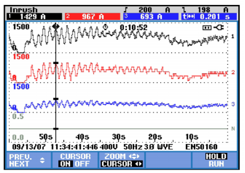 上圖為華天HTEQ系列高速動態(tài)消諧無功補償裝置實時跟蹤補償效果實測數據。黑色曲線為快速波動的負荷電流,紅色曲線為實時跟蹤的補償電流,藍色曲線為補償后網側電流。HTEQ跟蹤迅速準確,補償前負載峰值電流高達1423A,補償后降低為693A,電流波動幅值也由原來的約900A降低至350A左右。